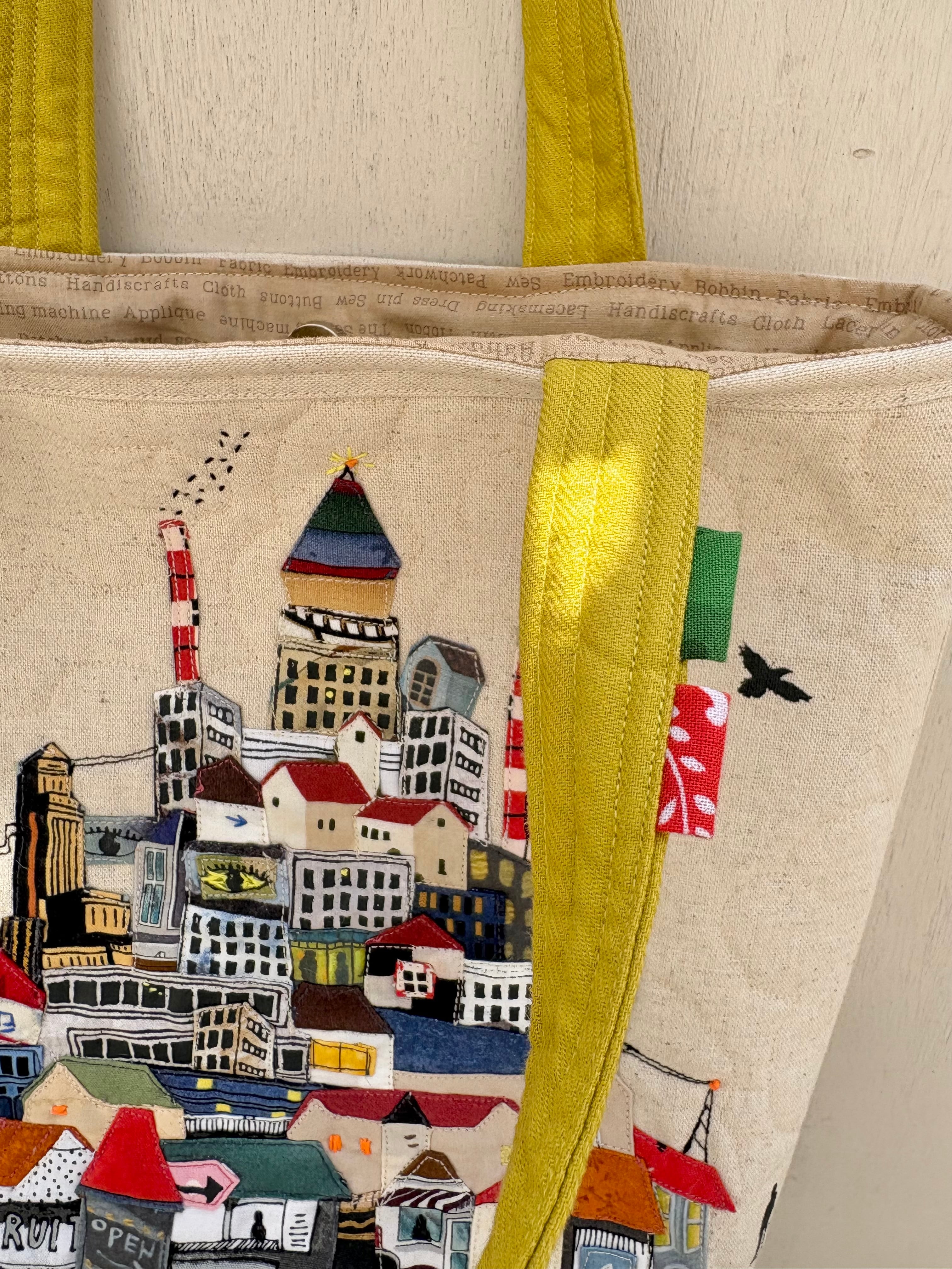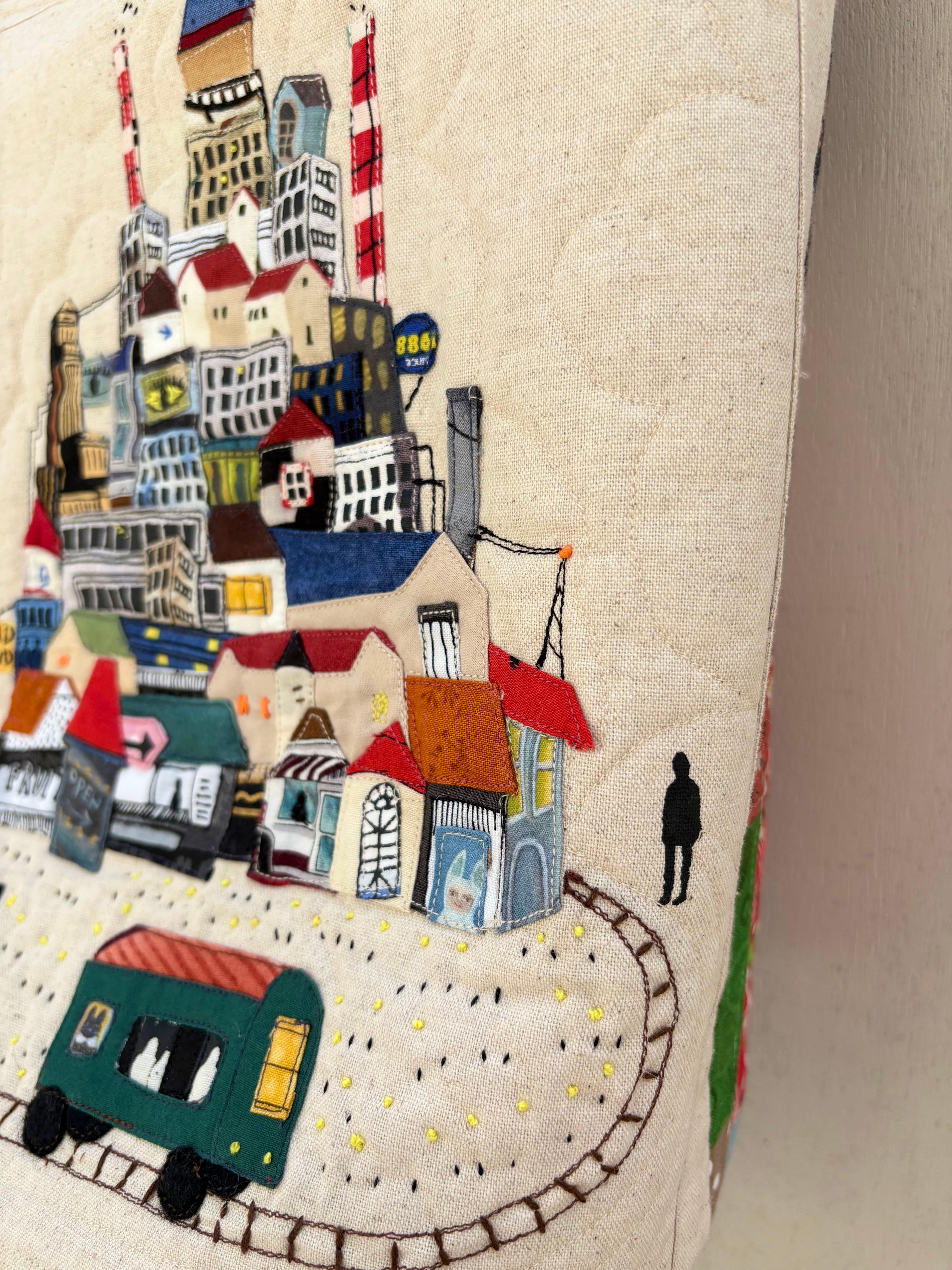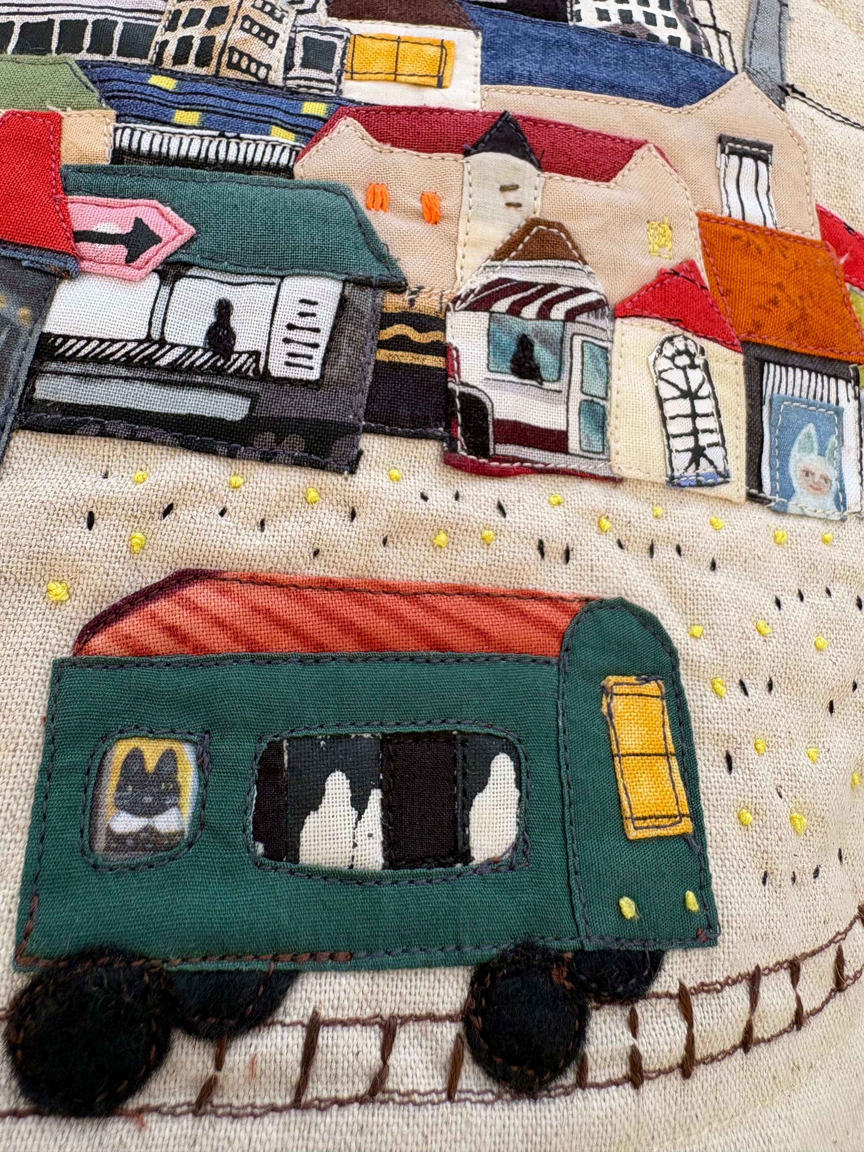 このかばんは量産品のバッグではなく、布と刺繍・アップリケなどで制作した一点物のアート作品です。